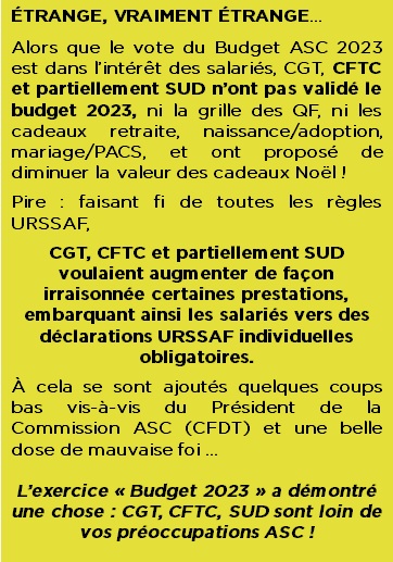 C’est pourquoi, Président de la Commission ASC (CFDT), Secrétaire (CFDT) et Trésorier ont travaillé sur le budget 2023 … qui a été validé par la majorité des élus au CSE de la fin octobre !